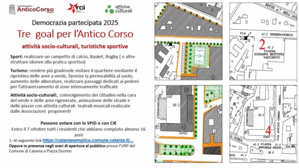 Oggi abbiamo bisogno di ognuna e ognuno di voi. C’è l’opportunità che qualcos’altro cambi all’Antico Corso, che altri territori in mano alla mafia vengano liberati. Il pretesto è un progetto presentato al Comune, nell’ambito dei finanziamenti per la democrazia partecipata, volto a riqualificare tutte le zone abbandonate del quartiere: da via Antico Corso a piazza Vaccarini.